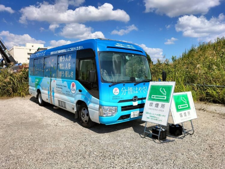 当日は真夏のような日差しでしたが、分煙バス内は日差しを避けつつ、強力な換気・空調システムで快適な環境の中で喫煙出来るのでご好評いただきました。